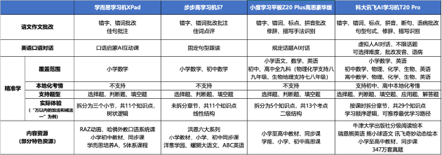 四款产品中,步步高适合偏低学龄儿童;学而思门槛较高,但在师资力量上一直比较受家长认可;小度初步引入大模型功能,并拥有较为优质的独立课程资源;科大讯飞对大模型的应用最充分,行业首创的精准学功能引领了行业发展、并保持不小优势,可以围绕孩子薄弱点精准提升、帮助孩子减负增效。