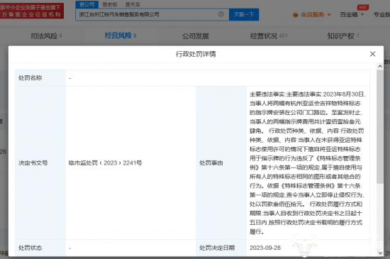 天眼查APP显示,日前,江铃汽车集团在台州区域唯一授权的一级代理商:浙江台州江铃汽车销售服务有限公司,在未获得亚运特殊标志使用许可的情况下,擅自将亚运特殊标志用于指示牌的行为违反了《特殊标志管理条例》......责令当事人立即停止侵权行为,处以罚款350元。