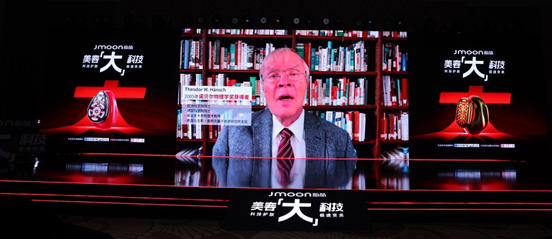 大会现场,诺贝尔物理学奖获得者、德国马克斯·普朗克量子光学研究所主任、物理学家 Theodor W.Hänsch教授通过视频介绍极萌在声光电领域的科研攻坚成果。作为极萌“首席科学家”,他为极萌美容仪黑科技创新能力提供了科学研究方向和学术眼界支持。