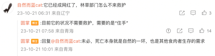 他还在回复中表示,死亡本身就是自然的一环,也是其他食肉者生存的需求……目前这只狼的状况不需要救护,需要的是“住手”。