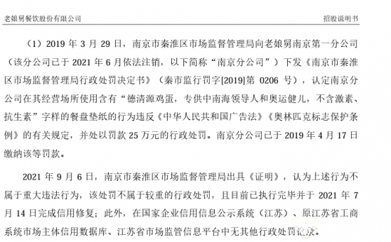 值得注意的是,据公司招股书显示,在2019年,南京市秦淮区市场监督管理局向老娘舅南京第一分公司(该分公司已于2021年6月依法注销,以下简称“南京分公司”)下发《南京市秦淮区市场监督管理局行政处罚决定书》(秦市监行罚字[2019]第 0206 号),认定南京分公司在其经营场所使用含有“德清源鸡蛋,专供中南海领导人和奥运健儿,不含激素、抗生素”字样的餐盘垫纸的行为违反《中华人民共和国广告法》《奥林匹克标志保护条例》的有关规定,并处以罚款25万元的行政处罚。南京分公司已于2019年4月17日缴纳该等罚款。