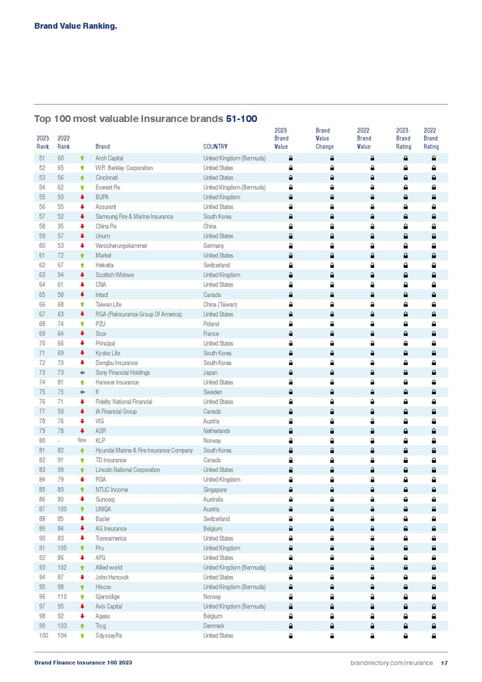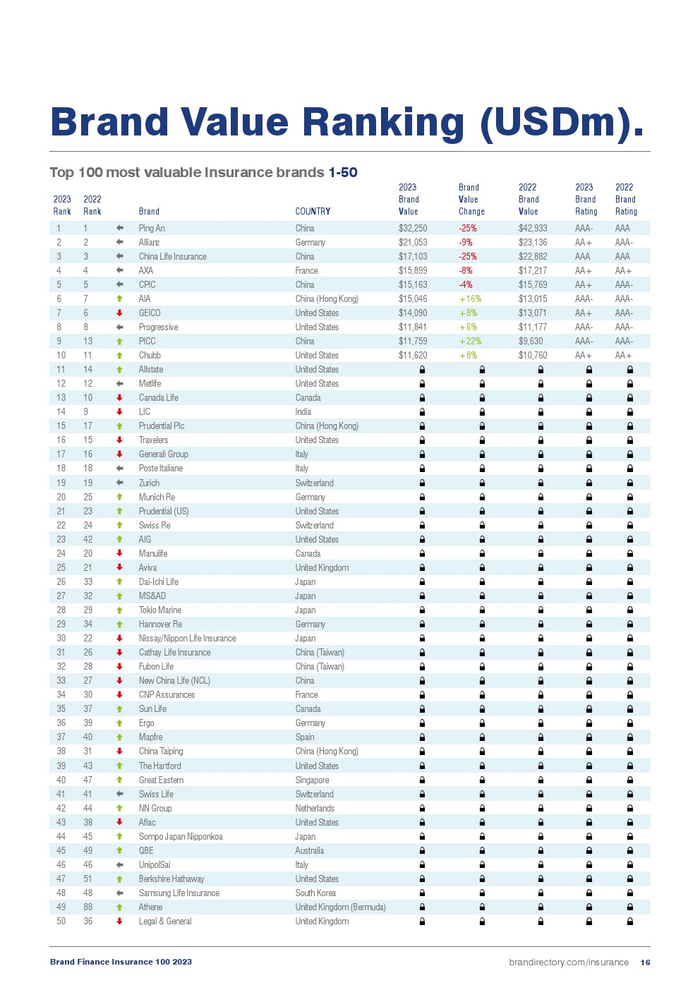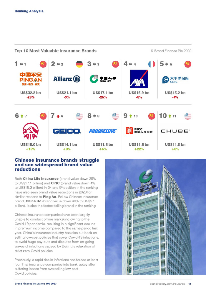 排名第三和第五位的中国人寿(品牌价值下降 25%,达到171 亿美元)和中国太平洋保险(品牌价值下降 4%,达到152 亿美元)在 2023 年也出现了品牌价值下降,原因与中国平安类似。同为中国保险品牌的中国再保险(品牌价值下降 48%,达到21 亿美元)也是排名中下降最快的品牌。