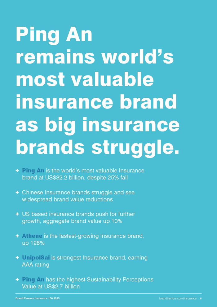 中国平安连续7年蝉联全球最具价值保险品牌,品牌价值322亿美元。尽管品牌价值同比下降 25%,但中国品牌仍保住了这一称号。