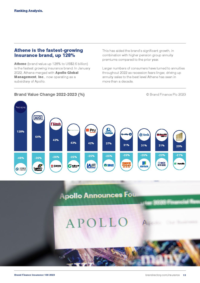 Athene 是增长最快的保险品牌,品牌价值增长 128%