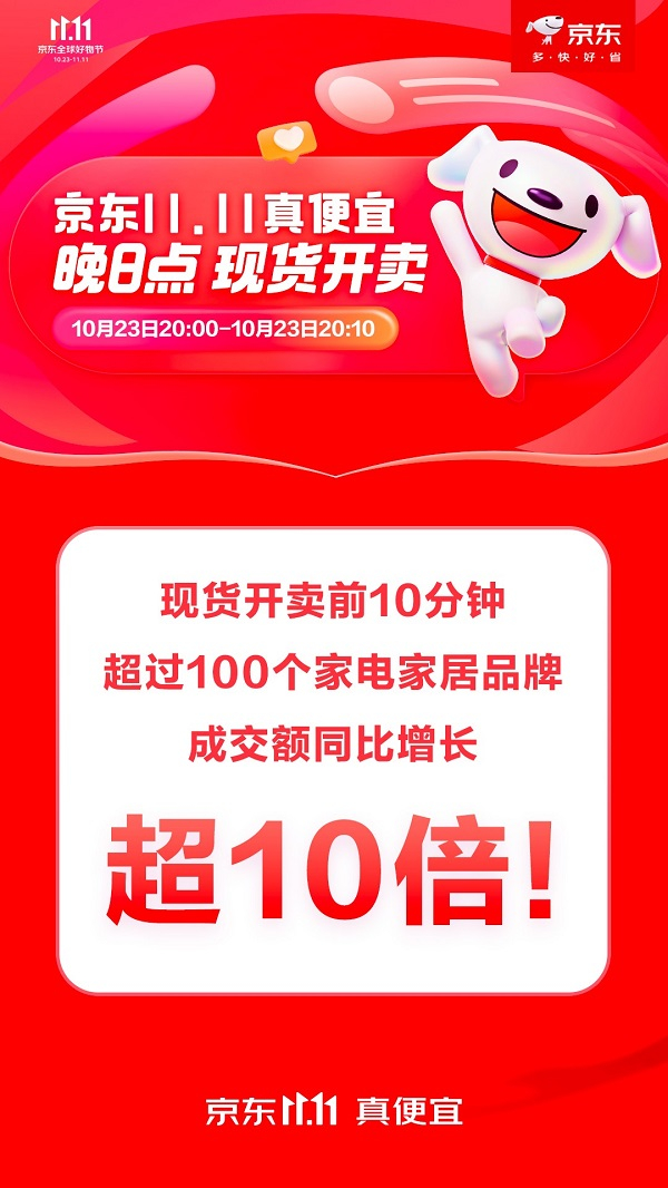 京东11.11开售10分钟战报出炉 家电家居以旧换新成交额同比增长超13倍