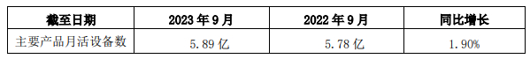 在主要产品方面,截至2023年9月30日,公司主要产品月度活跃设备数为5.89亿,同比增长1.90%。