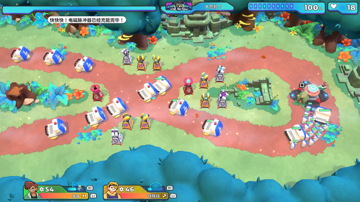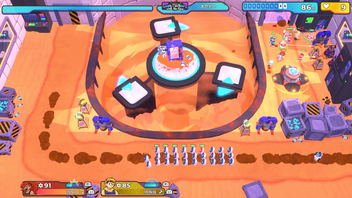 这是一款结合了动作要素的塔防游戏。从游戏内外的设计来看,这款作品其实在朝着派对游戏的方向迈进。从打开游戏的第一眼,各种可爱元素扑面而来,萌萌智械摆烂造反,四个怪才上天下海。