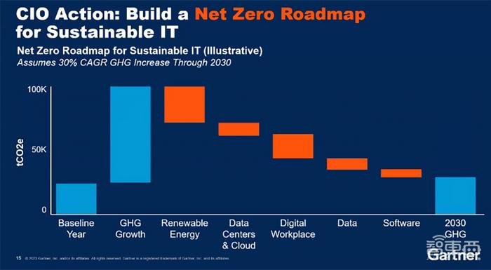 CIO要提前做好“可持续IT规划”,包括:(1)“Sustainability of IT”,指IT部门要考虑提高能源效率、资产利用率,从供应链方面开始进行可持续规划;(2)“Sustainability with IT”,指企业有碳排放或可持续的要求,首先要收集数据,知道企业到底排放了多少碳或者用了多少电,然后进行数据收集和管理、分析和汇报。Gartner预测,到2027年,25%的CIO的个人薪酬将会与他们对于可持续技术的影响挂钩。