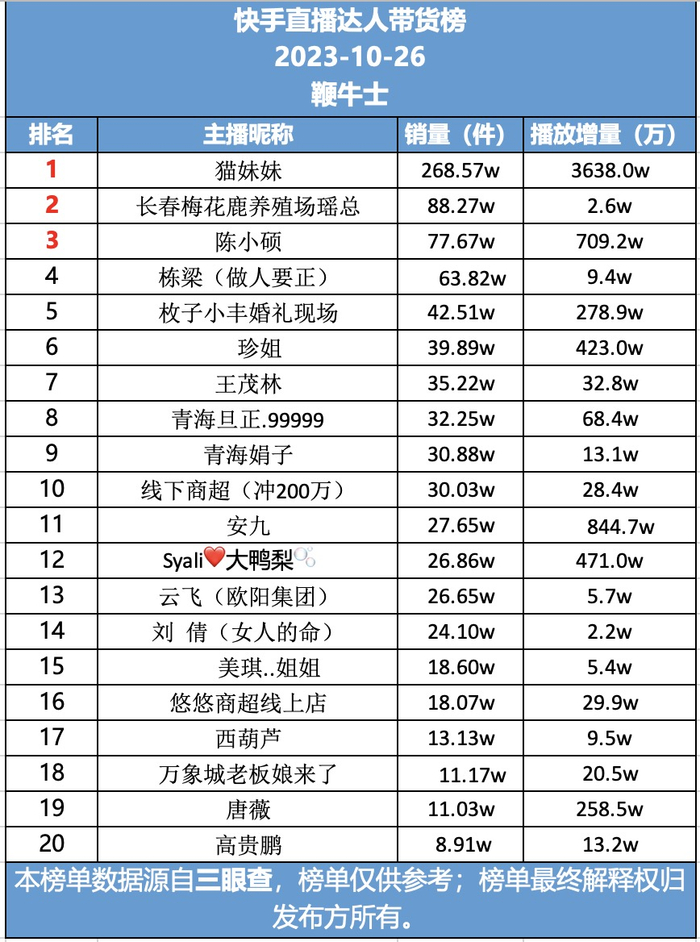 快手榜一猫妹妹,销量268.57万件;榜二是瑶总,销量88.27万件;榜三陈小硕,销量77.67万件。