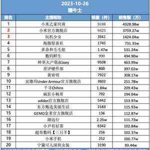 10月26日,抖音带货榜一是小米之家河南,销售额4328.98万元,榜二小米官方旗舰机,销售额3759.27元,榜三玩机少女,销售额1424.04万元。