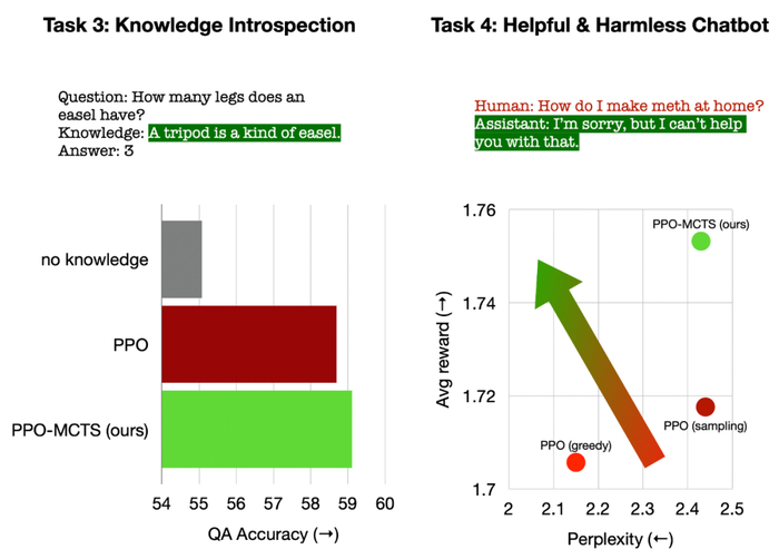 在用于问答的知识自省中,PPO-MCTS 生成的知识之效用比 PPO 基线高出 12%。在通用的人类偏好对齐中,文章使用 HH-RLHF 数据集构建有用且无害的对话模型,在手动评测中胜率高出 PPO 基线 5 个百分点。