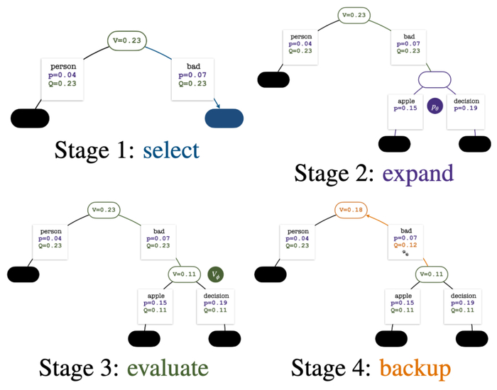 树的构建从一个代表当前 prompt 的根结点开始。每回合的模拟包含以下四步:
