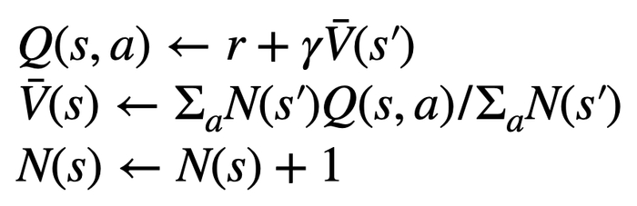 2. 在评估步骤中,将新探索节点子边的 Q 值初始化为该节点的评估价值(而非原版本 MCTS 中的零初始化)。该更改解决了 PPO-MCTS 退化成完全 exploitation 的问题。