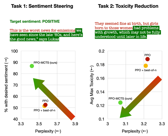 在控制文本情绪中,PPO-MCTS 在不损害文本流畅度的情况下,目标完成率比 PPO 基线高出 30 个百分点,在手动评测中的胜率也高出 20 个百分点。在降低文本毒性中,该方法的生成文本的平均毒性比 PPO 基线低 34%,在手动评测中的胜率也高出 30%。同时注意到,在两个任务中,运用 best-of-n 采样并不能有效提高文本质量。