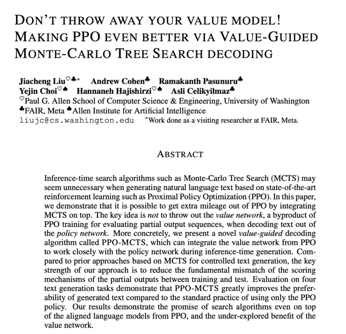 PPO-MCTS 提出利用这个价值模型指导 MCTS 搜索,并通过理论和实验的角度验证了其效用。作者呼吁使用 RLHF 训练模型的研究者和工程人员保存并开源他们的价值模型。
