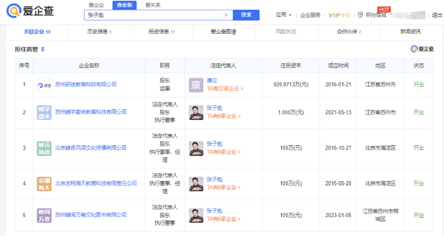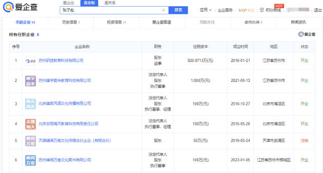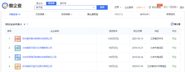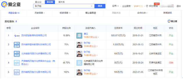 爱企查App显示,张雪峰(本名张子彪)名下共关联6家企业,版图涉及教育科技和文化传播,其中5家为存续状态,包括苏州峰学蔚来教育科技有限公司、苏州研途教育科技有限公司、北京峰言风语文化传播有限公司、北京志翔海天教育科技有限责任公司以及苏州峰阅万卷文化图书有限公司。在上述存续状态的企业中,张雪峰在4家公司担任法定代表人,在5家公司担任执行董事、经理、监事等职务,并持有4家公司股份。