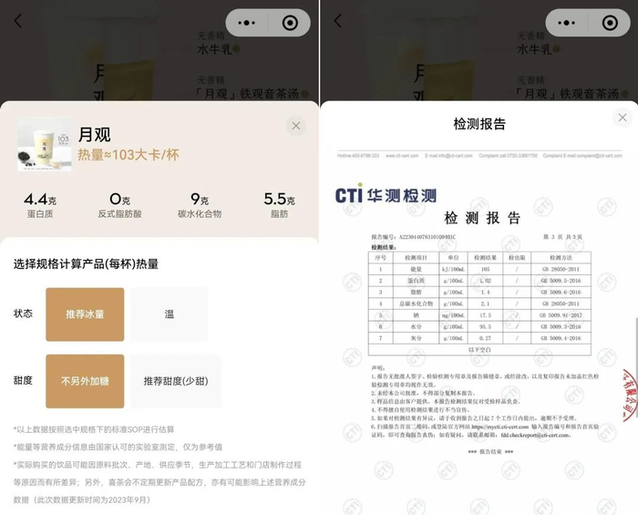 比如霸王茶姬,今年8月在其公众号上线了“产品身份证”,首批公布了6款产品的热量和营养成分,在门店菜单、小程序、外卖等渠道上线“低负担控糖专区”。后续9月份上线了热量计算器,同时进一步公开了超30款产品的“产品身份证”。
