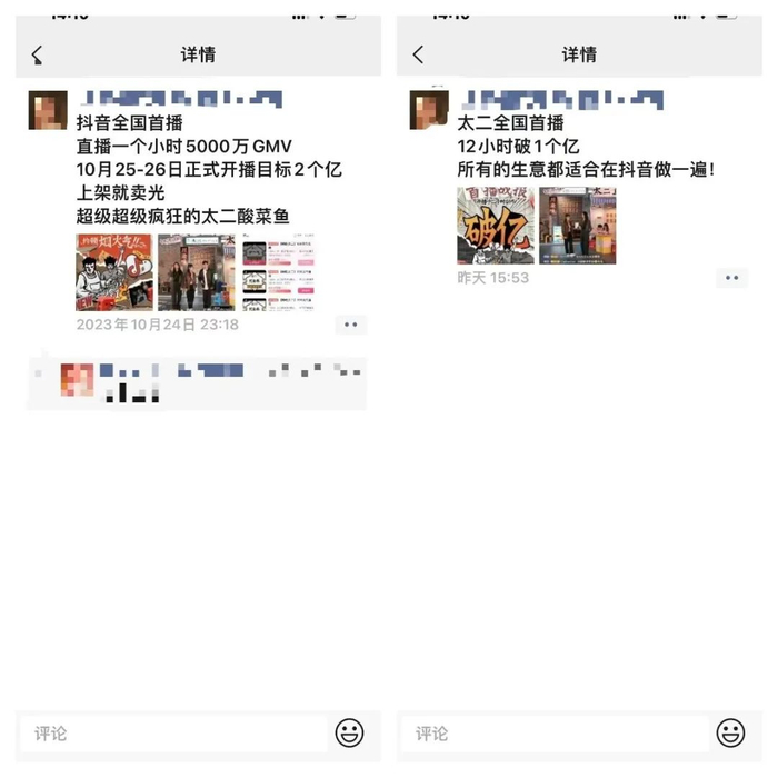 这一事件发生前,太二酸菜鱼刚刚在抖音完成直播首秀。根据业内流传的一张朋友圈截图显示,太二酸菜鱼在10月24日启动首场首播,1小时实现5000万GMV,12小时突破1亿元,10月25日-26日正式开播目标2亿元。