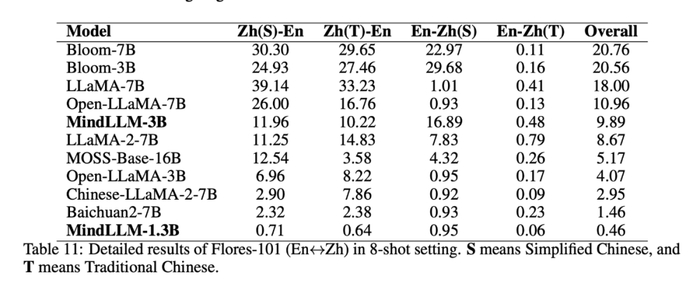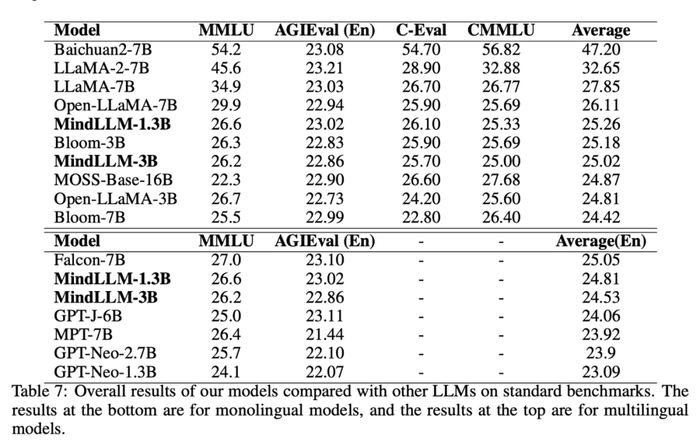 此外,我们发现数据量更少,但是使用了中英文数据训练的MindLLM-1.3B在MMLU上的表现优于GPT-Neo-1.3B,我们推测这可能是双语学习带来的增益,因为不同语种在能力之间也存在共通性。详细实验和分析可查看论文4.4节。