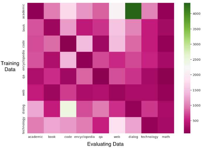 不同数据集展现出不同程度的泛化能力,例如:网页文本、百科全书和问答数据训练的模型在多个数据源上展现出较强的泛化能力,表明它们的内容包含了各个领域的多样信息。相比之下,学术论文数据和代码数据训练的模型在数学能力上表现出色,但在泛化方面较弱,可能是由于领域特定性和独特的格式信息。