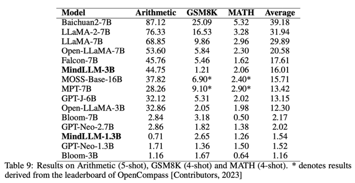 我们的评估结果优于部分大型模型,在未使用指令微调和对齐时,MindLLM模型 在 MMLU 和 AGIEval 评测上的性能优于 MPT-7B 和 GPT-J-6B 等大型模型。在中文方面,MindLLM 在 C-Eval 和 CMMLU 上表现出与更大参数模型相当的性能。具体来说,MindLLM-3B 在数学能力上优于 MOSS-Base-16B、MPT-7B 等较大模型,在双语能力上超过 Baichuan2-7B 和 MOSS-Base-16B。而且,MindLLM-1.3B 在数学上比同等大小的 GPT-Neo-1.3B 更好。