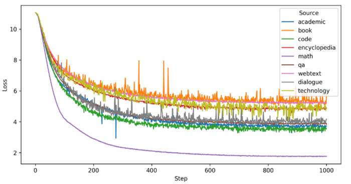 我们将每个数据来源等比例缩小,用于训练15M参数量的模型。如下图所示,不同类型的数据对学习效率和模型最终结果有不同的影响。例如,数学题数据的最终损失较低,学习速度较快,表明它具有更为明显的模式且容易学习。相比之下,来自信息丰富的书籍或多样化的网络文本的数据需要更长的适应时间。一些领域相似的数据可能在损失上更为接近,例如技术相关数据和百科全书。