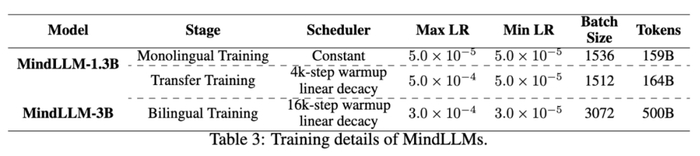我们使用了两种不同的策略从头训练双语模型MindLLM。对于MindLLM-3B,我们直接在混合的中英文双语数据上预训练了800,00步,同时学习中英文能力;对于MindLLM-1.3B,我们首先在英文数据集上进行预训练101,100步,然后使用中英文混合数据训练了105,900步。预训练细节如下: