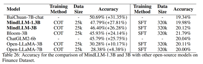 实验结果表明,通过补充辅助信息,可以在不同程度上提升所有baseline模型和MindLLM模型效果。进一步可观察到,COT 训练使得 MindLLM-1.3B 和 3B 的性能比 SFT训练性能分别提高了 27.81% 和 26.28%,除了Baichuan-7B以外,MindLLM比其他模型提高幅度更加显著。此外,MindLLM-1.3B 和 3B 在相同规模下达到了最佳性能,而且超过了 ChatGLM2-6B 和 Open-LLaMA-7B。