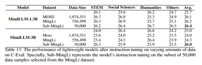 对于MindLLM来说,指令微调的数据质量要比数据数量更加重要。