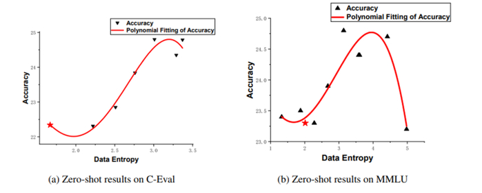 图像中红色五角星的点为预训练模型的熵值。根据分析可知,当数据的熵比预训练模型的熵高1-1.5时,模型经过该区间的数据指令微调后性能最佳。因此,我们通过数据熵定义了高质量数据,并且提出了筛选高质量数据的方法。