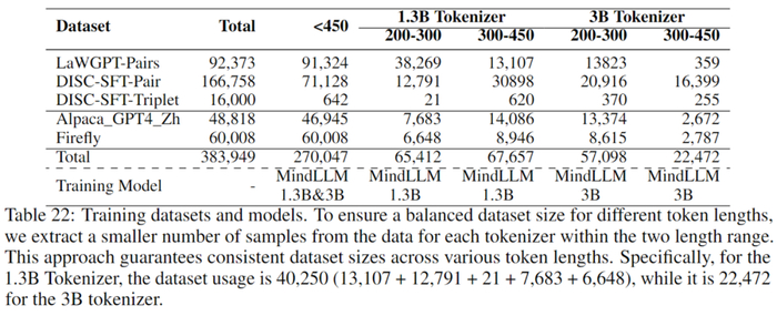 我们收集了一些公开的法律相关数据,并结合了一些通用指令数据对 MindLLM 进行指令微调 (SFT)。为了探究数据的 token 长度是如何影响模型在具体领域上的性能的,我们使用不同数据长度的数据来分别训练 MindLLM。我们首先筛选了长度小于450的全部数据,然后分别使用 MindLLM-1.3B 和 MindLLM-3B 的Tokenizer筛选出长度在200-300和300-450之间的数据。数据统计和所对应的训练模型如下表所示: