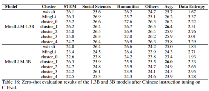 如何定义高质量的指令微调数据?有学者提出指令微调数据的多样性可以代表指令微调数据集的数据质量。然而根据我们的实验发现,指令微调的数据熵和数据长度会更加影响轻量级模型的性能。我们将每条数据在预训练模型上的交叉熵损失定义为该数据的数据熵,并通过K-Means算法依据数据熵对数据进行聚类得到不同的数据簇。MindLLM经过每个数据簇的指令微调后再C-Eval的结果如下表所示(MMLU的结果详见论文Table19):