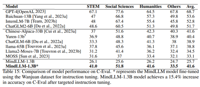 为了探究MindLLM能否经过指令微调有效的提升其特定能力,我们使用万卷数据集中的exam数据部分微调模型,目的是为了增强模型的学科知识能力。我们在C-Eval上进行了评估,结果如下: