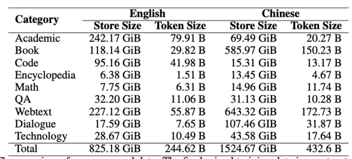 我们使用英文和中文两种语言的训练数据。英文数据源自Pile数据集,经过进一步处理。中文数据包括来自Wudao、CBooks等开源训练数据,以及我们从互联网上爬取的数据。为确保数据质量,我们采用了严格的数据处理方法,特别是对于从网络爬取的数据。