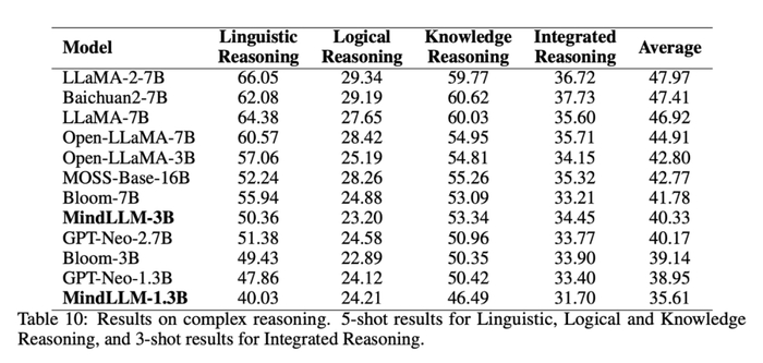 我们发现,MindLLM-3B在数学能力上的平均分数达到了16.01,超过了MOSS-Base-16B(15.71)和MPT-7B(13.42),GPT-J-6B(13.15)。此外MindLLM-1.3B的数学平均水平也超过了相同大小的GPT-Neo-1.3B。以上结果表明,轻量级模型在数学上有着巨大的潜力,较小的模型也可以在具体领域表现出超越或者与更大模型相当的水平。进一步,我们可以看到数学能力较为出色的(均分≥15),除MindLLM-3B,均为7B左右的模型。这表明,如数学能力类似的复杂能力的全面获取可能会收到模型规模的限制,这一猜测可以进一步在模型双语能力和推理能力的评估进一步体现。