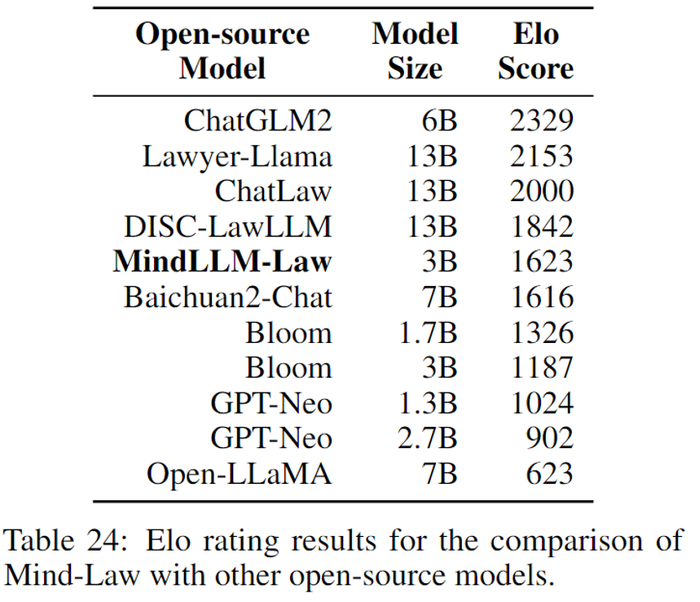 为了避免人类评估产生的偏差和专业知识不足造成的错误,我们使用采用chatgpt作为评估器,具体方法如下。由ChatGPT生成的多轮法律咨询对话数据集,提取了其中100个对话作为我们的评估数据。我们使用ChatGPT来评估模型对于法律咨询的回复,让ChatGPT对于模型的回复进行排序,再根据排序结果计算Elo分数。最终筛选出一个最佳模型作为 MindLLM-Law 和其它开源模型相比较。