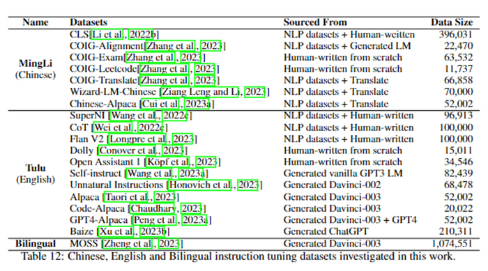 我们想要探讨在轻量级模型上,不同类别数据集的指令微调会有什么样的性能表现。下表是我们使用的指令微调数据集,包含我们重新构造的中文数据集MingLi、公开数据集Tulu(英文)和中英双语数据集MOSS。