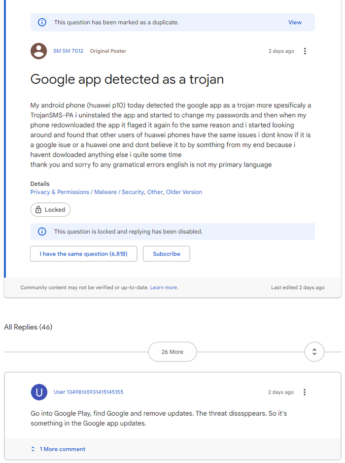 大量海外华为 / 荣耀用户反馈称 Google 应用被手机识别为木马