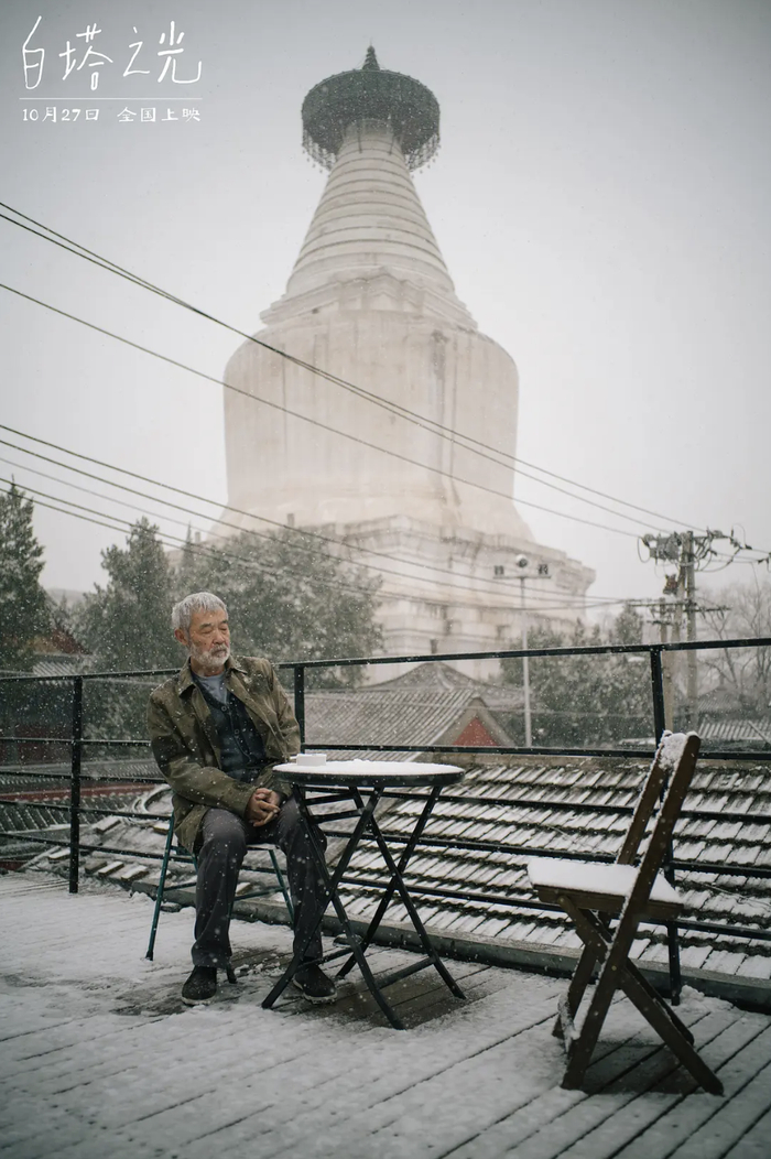 首先从片名说起。据张律解释,他想写一个关于北京的剧本。北京非常规整,在这样的城市布局上,出现一个浑圆向上的建筑,看起来很突兀。但正是白塔的浑圆、颜色与反光,似乎能给人的情感与精神带来一种慰藉。同时,白塔附近有一个酒店,叫“白塔之光”,正是剧组下榻之所。中文片名由此而来。