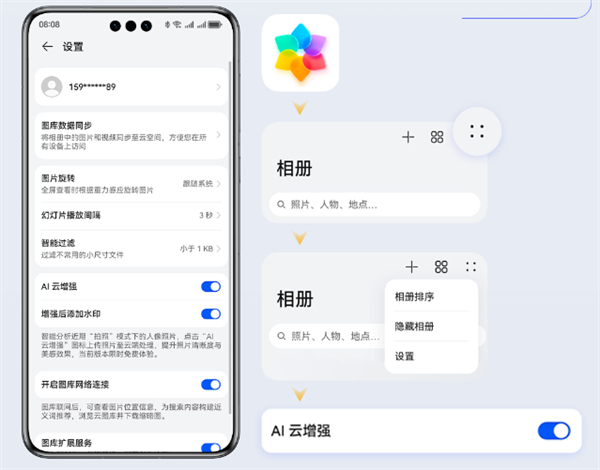 升级后,大家就能在图库的设置中找到“AI云增强功能”,打开即可。