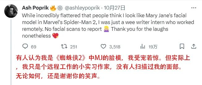 事实上,Ashley Poprik仅仅是Insomniac的一名写作实习生。《蜘蛛侠2》发售当天,斯蒂芬妮也证实过,《蜘蛛侠2》中的MJ正是她本人。然而,斯蒂芬妮本人的动态远不及谣言的热度高,在舆论的漩涡中,人们需要的并不是真相,而是一个发泄的出口。
