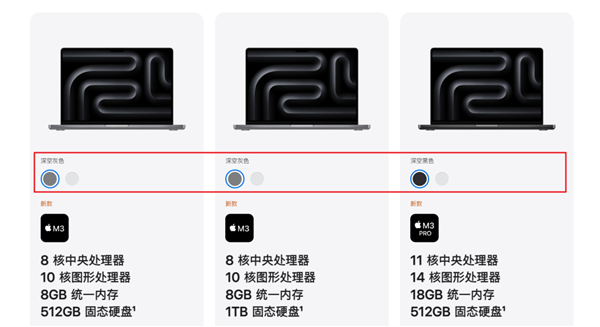 然而这配色也不是所有版本都有,只有搭载 M3 Pro 和 Max 的 MacBook Pro 才能选深空黑,基础款 M3 芯片的 MacBook Pro 还是只能选深空灰和银色。