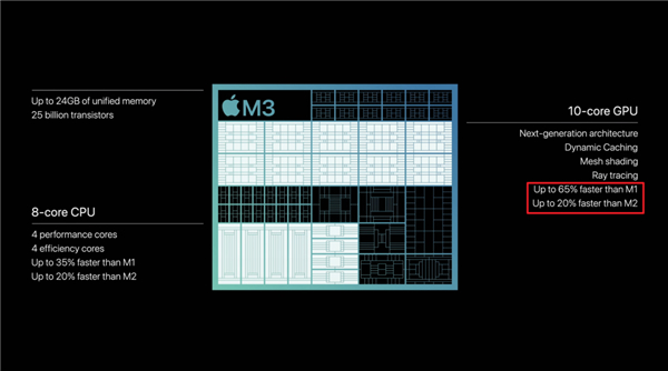 根据苹果的 PPT 来看,M3 的 CPU 性能比 M1 提升了 65%,比 M2 提升了 20%;而 GPU 性能则比 M1 提高了 35%,对比 M2 也有是有 20% 的提升: