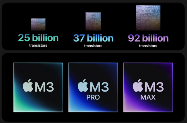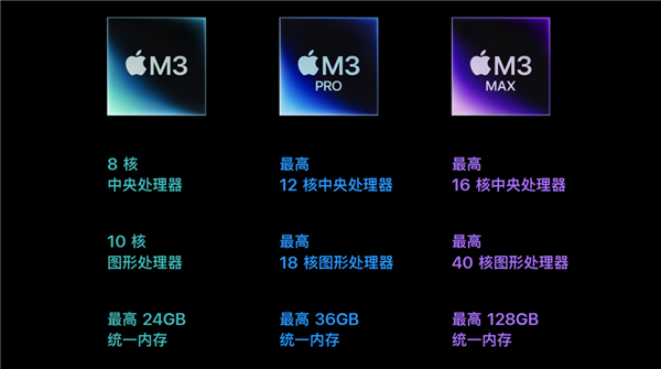 苹果这次一共发布了三款芯片,分别是 M3、M3 Pro 以及 M3 Max。