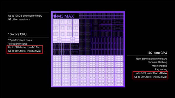 它的 CPU 则比 M1 Max 提升了 80%,相比起 M2 Max,它的 CPU 提升了 50%,而在 GPU 方面对比前两代也有 50% 和 20% 的提升: