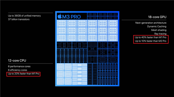 而 M3 Pro 的 CPU 性能比 M1 Pro 强了 40%,对比 M2 Pro 也有 10% 的提升;而在 GPU 方面比 M1 Pro 强了 20%: