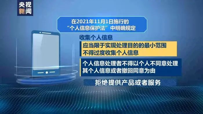 据了解,在2021年11月1日施行的“个人信息保护法”中明确规定,收集个人信息,应当限于实现处理目的最小范围,不得过度收集个人信息;而且,个人信息处理者不得以个人不同意处理其个人信息或者撤回同意为由,拒绝提供产品或者服务。