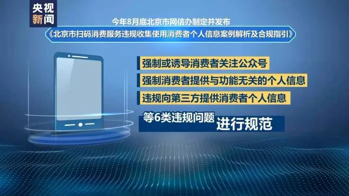 据了解,今年8月底北京市网信办制定并发布了《北京市扫码消费服务违规收集使用消费者个人信息案例解析及合规指引》,其中对于强制或诱导消费者关注公众号、强制消费者提供与功能无关的个人信息、违规向第三方提供消费者个人信息等6类违规问题进行了规范。