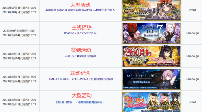 以上图为例,FGO玩家在整个8月都在体验「北极•夏日世界!」这个大型主题活动。9月开始,先是持续2周的佛系签到,以及为第七章主线故事做预热的「Road to 7」,然后又是一个持续三周的大型主题活动。