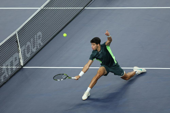 2023年上海劳力士大师赛上,劳力士代言人卡洛斯·阿尔卡拉斯正手击球